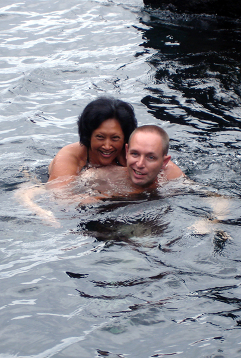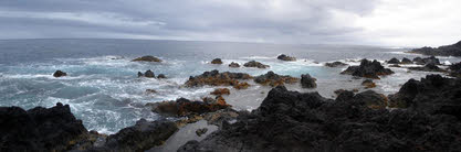 Onze eerste stopplaats was Ponta da Ferraria. Deze vulkanische kust was ooit gevormd door een vulkaan. Doordat het onder de gestolde lava nog vrij warm is, is hier een stukje zee dat bij eb lekker warm is.