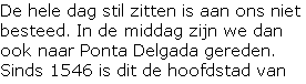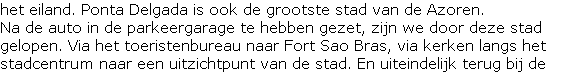 Vandaag gaan we dus de westzijde van het eiland bezoeken. Maar dit doen we niet met onze eigen huurauto, maar met een jeeptour. Het voordeel hiervan is dat we over smalle bergpaadjes kunnen rijden, die niet geschikt waren voor onze auto. We waren dus al op tijd weer in Ponta Delgada.
