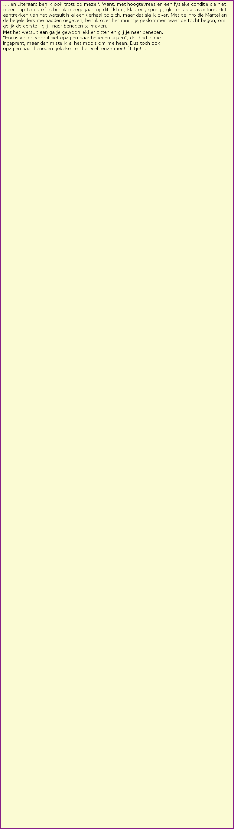 En het was kicken! Even soepeltjes als bij Marcel of de anderen die dit al eerder hadden gedaan, zo ging het natuurlijk niet. De begeleiders hielpen me naar het abseilpunt, maar ik heb ZELF de afdaling gemaakt en ben heelhuids beneden gekomen. Zo ook bij