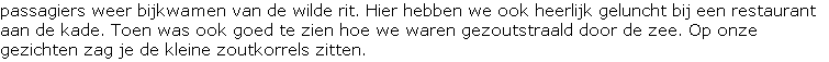 het frisse water en kregen ook een snorkel te leen. Hiermee hebben we de visjes en de bodem van het "meer" verkend. Met af en toe een inkomende golf was het heerlijk deinen in het water. De zon was ook volop aanwezig, waardoor we een lekker warm kleurtje hebben opgedaan. Aan het eind van