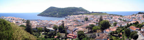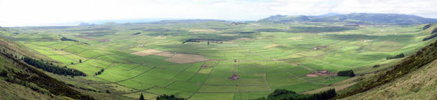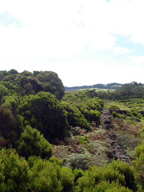 korte stop gemaakt bij de vuurtoren. Daarna zijn we door gereden richting Praia da Victoria. Ook hier vonden we niet veel leuks, dus zijn wat meer landinwaarts gegaan. Via een klinkerweg kwamen we uiteindelijk op Serra do Cume. Als kraterrand van oudste vulkaan Cinco Picos hadden we hier op ruim 500 meter hoogte een schitterend uitzicht over de weilanden richting de hoofdstad.