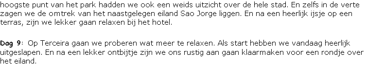 Een van de laatste stops was bovenop de berg Sierra Santa Barbara op 1021 meter hoogte. Vanaf hier hadden we een magnifiek uitzicht over een groot deel van het eiland, maar ook van Sao Jorge en Pico in de verte. Omdat we boven de wolkengrens zaten, zagen we de berg Pico ook boven de rest uitsteken. Vanaf hier zijn we langs de kust weer terug gereden naar het hotel.