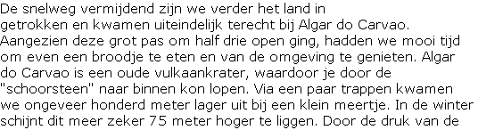 omgeving en het vuurmeer zelf. We hadden ook tijd genoeg om al het prachtige in ons op te nemen en op de foto te zetten. We zijn daarna via de andere weg omlaag gereden, waarbij we nog een tussenstop maakten bij Caldeira Velha. Ook hier was de omgeving weer net even anders doordat er geen mist meer was.