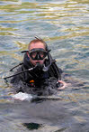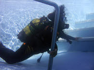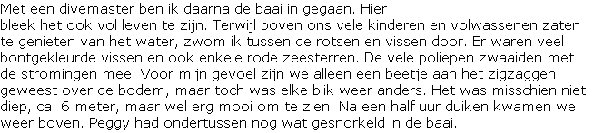 geboekt. Dat wil zeggen dat we in het zwembad even gingen oefenen met duiken en daarna gaan we het zoute nat in. Aangezien ik al vaker gedoken had en de oefeningen als eens eerder had gedaan, ging mij dit goed af. Peggy had ook geen moeite met de oefeningen, maar door het gewicht van de duikfles draaide ze telkens rondjes onder water. Ze had moeite de balans te houden. Na een paar rondjes door het zwembad hield ze het liever even voor gezien. We gaan dit thuis nog wel eens rustig oefenen.