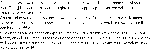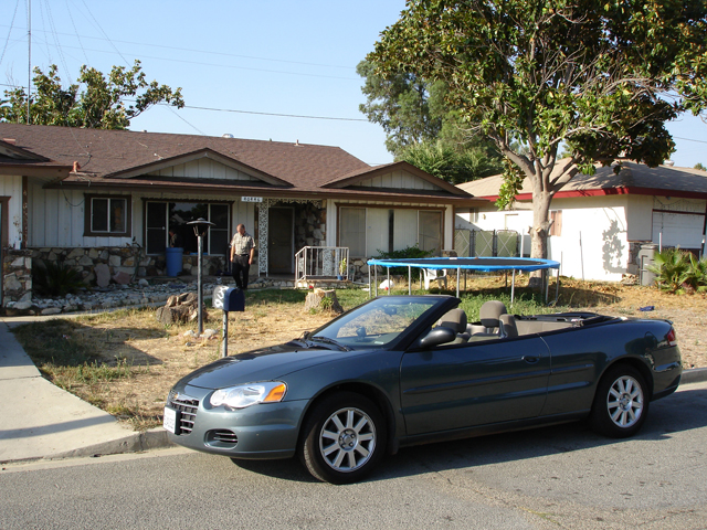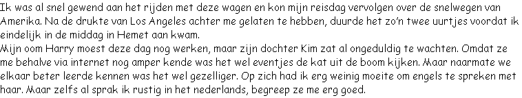 mee te nemen. Aangezien ik nog niets geregeld had, ben ik een willekeurige bus ingestapt. Het autoverhuurbedrijf hielp me aan een mooie wagen: Chrystler Seabring. Een cabriolet met allerlei handige snufjes en zelfs een autonavigatie in het Nederlands.