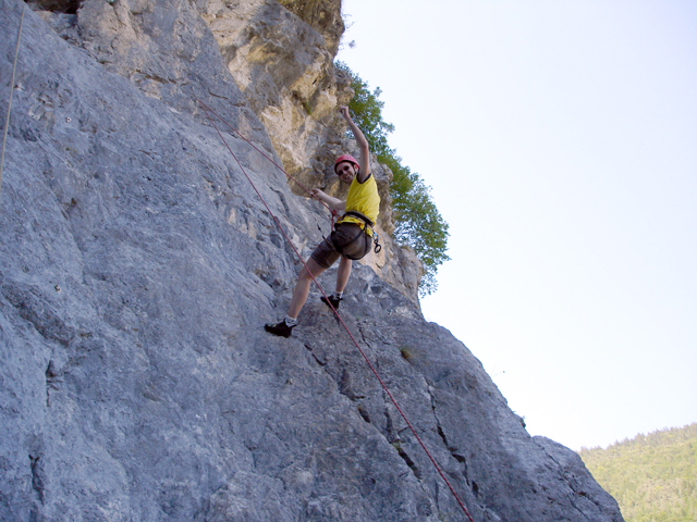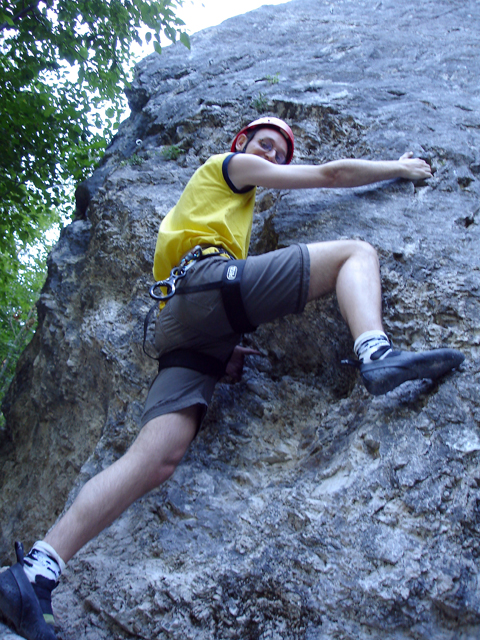 klimmen. Kom maar mee.” Een beetje verbaasd liep ik mee. Tristan trok het touw van de wand af, klikte diverse carabinieri aan mijn gordel vast, maakte het touw aan mijn gordel vast en zei dat ik kon gaan. Ik mocht toen mijn eigen route naar boven klimmen, het touw onderweg vast zetten aan de wand, oftewel voorklimmen. Hoe hoger ik kwam des te moeilijker het was om geschikte punten te vinden om me vast te houden.