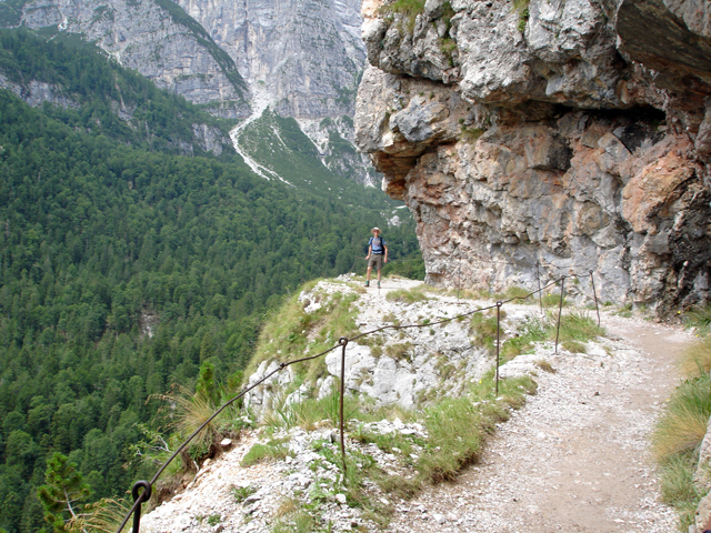Het volgende stuk van de wandeling liep over een smal pad langs de steile berghellingen. Hier en daar stonden zelfs (gammele) hekjes. Maar de uitzichten waren zeer de moeite waard. En na een paar uurtjes wandelen kwamen we bij het derde berghutje aan, waar we even konden bijkomen. Bij dit berghutje