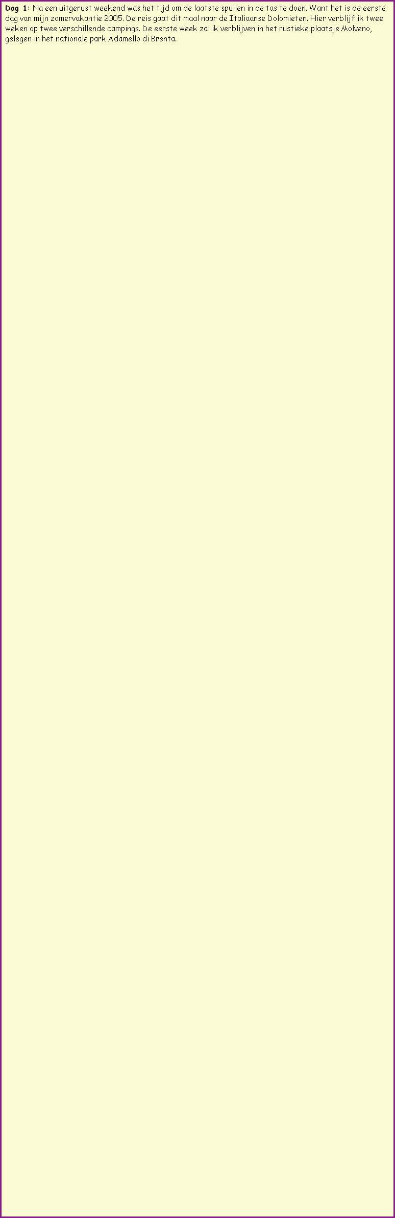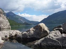 vorige vakantiegangers schoon waren en waren verlaten. Om de tijd te doden ben ik met een aantal mensen naar het meer Lago di Molveno gelopen, welke tegen de camping aan lag. Hier hebben we van het uitzicht genoten, zowel over het water als de omliggende bergen. Uiteindelijk waren de tenten beschikbaar en werden we ingedeeld. Nu bleek ineens dat er voor de reisgroep 25 t/m 39 jaar, niet voldoende tenten aanwezig waren. Dit resulteerde dat ik samen met een meisje (genaamd Heidi) in een tent werd ingedeeld. Een onverwachte gebeurtenis.