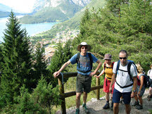 Dag 3: Vandaag de eerste actieve dag: een bergwandeling. Deze wandeling werd door bijna alle vakantiegangers ondernomen, waardoor we dus een vrij grote groep hadden. De tocht begon door het dorp heen de berg op. Aan het andere eind van het dorp namen we een bospad omhoog, waarbij we mooie uitzichten hadden over het meer. Even later liep het pad door het bos naar het eerste berghutje. Hier hebben we dan ook gerust voordat we met een steile klim begonnen.