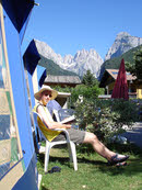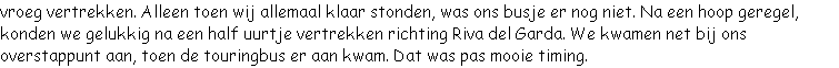 De twee uurtjes in de bus werd voornamelijk besteed aan het luieren, krantje lezen en rustig echt wakker worden. Via Riva del Garda (dit plaatsje klinkt al redelijk bekend) kwamen we rond een uurtje of negen aan op de camping. Om tien uur konden we onze tenten al betrekken en ons opgeven voor de diverse activiteiten die deze week mogelijk waren. Verder hebben we de dag rustig doorgebracht aan het water en wat boodschappen gedaan in het dorpje.