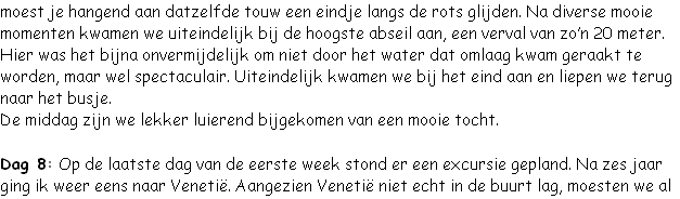 Toevallig was ik op dat moment net de laatste in de rij (van zeven). Van Tristan moest ik als eerste springen, aangezien de anderen het toch wat eng vonden. Maar nadat ik het voorgedaan had, zijn anderen ook gesprongen. Ook kwamen we een stuk tegen waarbij je je aan een touw langs de rots moest zekeren. Daarna