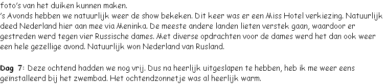 Dag 8: Deze laatste dag zouden we weer terug gaan naar Nederland. Onze vlucht zou pas in het begin van de avond vertrekken, waardoor we nog een hele dag voor onszelf hadden. Heel origineel hebben we deze ook vandaag weer doorgebracht rond het zwembad. Hierdoor konden we nog mooi de laatste plekjes van ons lichaam voorzien van een mooi bruin kleurtje.