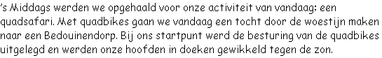 Bij het Bedouinendorp aangekomen was er eerst tijd voor een kop thee om even bij te komen. Dit was niet een echt Bedouinendorp. Hier waren de diverse huisjes ook gedeeltelijk