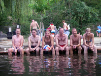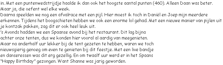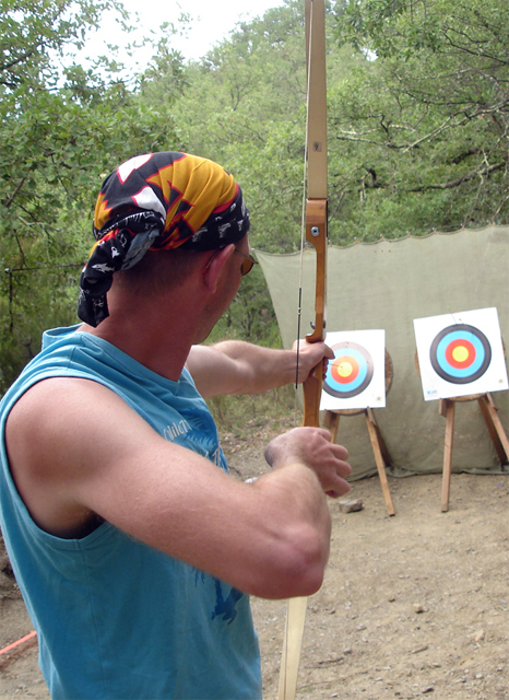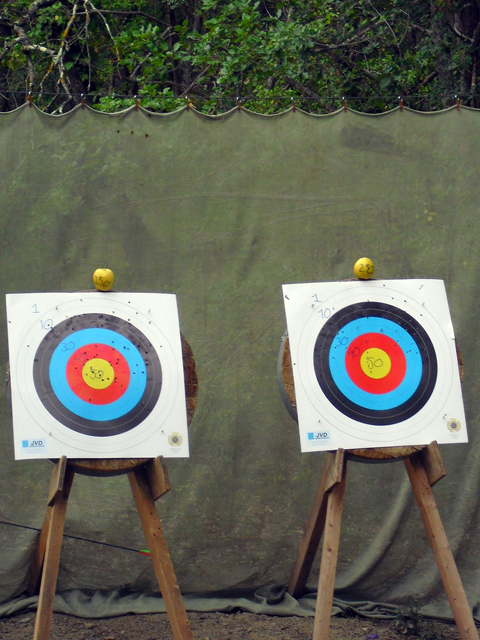 Terug op de camping hebben we na een verfrissende duik onze schietvaardigheid getest met boogschieten. Vlakbij de camping was hiervoor een mooi oefenterreintje. En na een korte uitleg vlogen de eerste pijlen richting het doel.