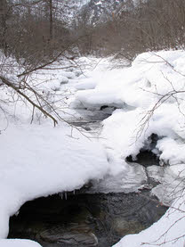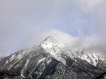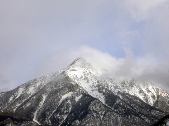 Na de lunch heb ik een wandeling in de omgeving gemaakt. Via diverse paadjes ben ik verder de berg opgelopen. Voor zover dat ging in ieder geval. Na een tijdje kwam ik bij een bergpaadje van een natuurpark. Hier lag vrij veel sneeuw, waardoor het lopen niet zo heel makkelijk meer ging. En de sneeuwschoenen, die we de eerste dag gebruikten, waren al ingeleverd bij de sportwinkel. Ondanks de winterse storm was het wel erg mooi om te zien hoe de sneeuw over en om de bergtoppen werd geblazen.