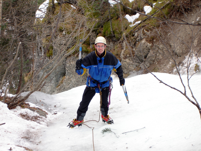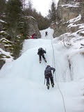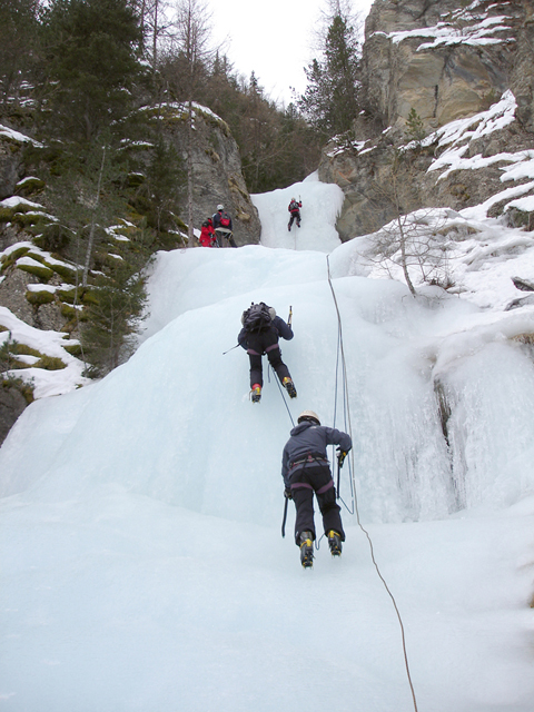 Dag 5: Met onze tweede klimdag kregen we een nieuwe uitdaging. In de buurt van het plaatsje Ceillac gaan we een waterval van 250 meter beklimmen. Terwijl de zon nog druk bezig was om boven de bergen uit te komen, reden we al naar deze uitdaging. Vanaf de parkeerplaats hadden we al een mooi uitzicht over onze klimroute. Hier deden we ook alvast onze klimspullen aan. Daarna liepen we een stukje naar boven, naar de voet van de waterval. Hier kregen we een korte uitleg over hoe we de route zouden beklimmen. Hierbij werd een vaste volgorde afgestemd. Ik werd hierbij de hekkensluiter. Voordat ik mijn stuk zou klimmen, moest ik eerst de karabijnen en ijsboren losmaken en meenemen.