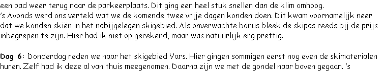 Dag 7: Op de tweede vrije dag ben ik niet wezen skiën. Het ging de eerste dag niet zo heel lekker. Daarbij was het weer deze dag ook niet zo bijzonder mooi. Net als gisteren waren er veel wolken en sneeuwde of regende het nogal. Daarom hield ik een lekker luierdagje in het huis. Nadat de rest vertrokken was, heb ik met mijn boek bij de kachel gezeten.