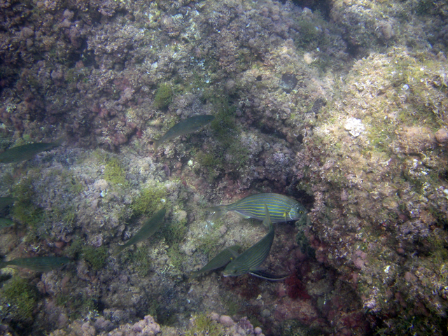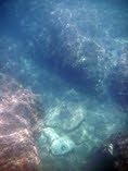 Langzaam zwommen we langs de rotsen omlaag. Dit ruwe landschap werd getekend door de vele rotsen en