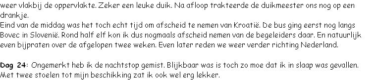 Op deze laatste avond in Kroatië gingen we met zijn allen naar de pizzeria in Opatija. Met een paar anderen ben ik hier naartoe gelopen langs hetzelfde wandelpad. Tijdens het eten kwam er ineens een enorme hoosbui langs. Op de weg terug naar de camping was deze gelukkig alweer voorbij zodat Güler en ik samen droog terug kwamen op de camping. ’s Nachts kwamen er alleen weer nieuwe onweerbuien langs.
