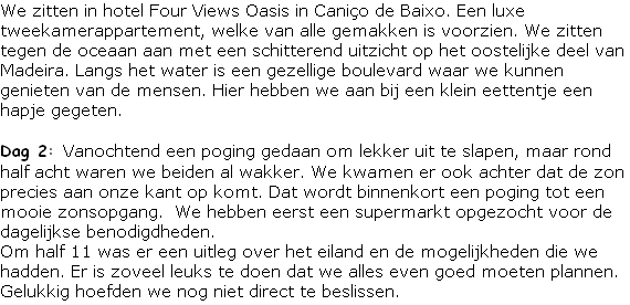 Dag 3: Deze ochtend hebben we bij de hostess gezeten om de excursies te plannen. We hadden de leukste geprobeerd uit te zoeken en na boeking bleven we maar met nieuwe keuzes komen. We kregen zelfs al de opmerking dat we hier zijn om te relaxen. En na een fortuin gespendeerd te hebben, is deze week in ieder geval goed gevuld.