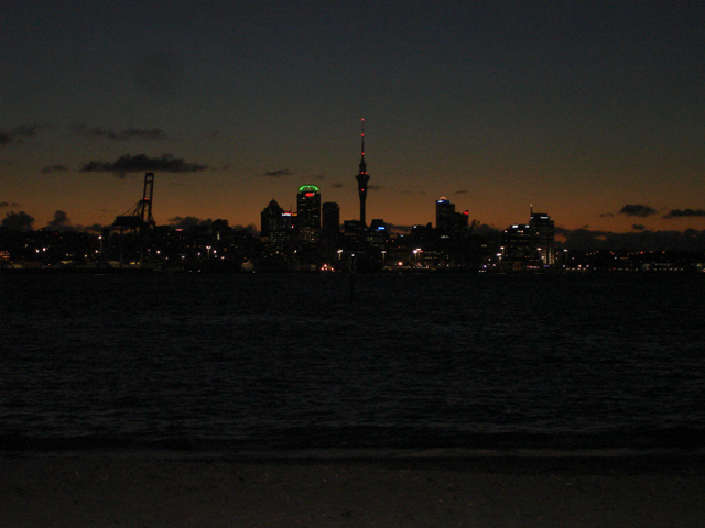 In een restaurantje hebben we lekker gegeten, waarna we in het avondlicht weer terug voerden naar Auckland. Vanaf de haven en de boot hadden we een mooi zicht op de skyline van Auckland met allerlei lichten.