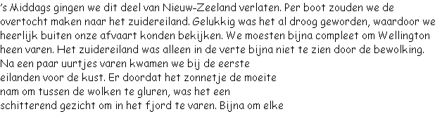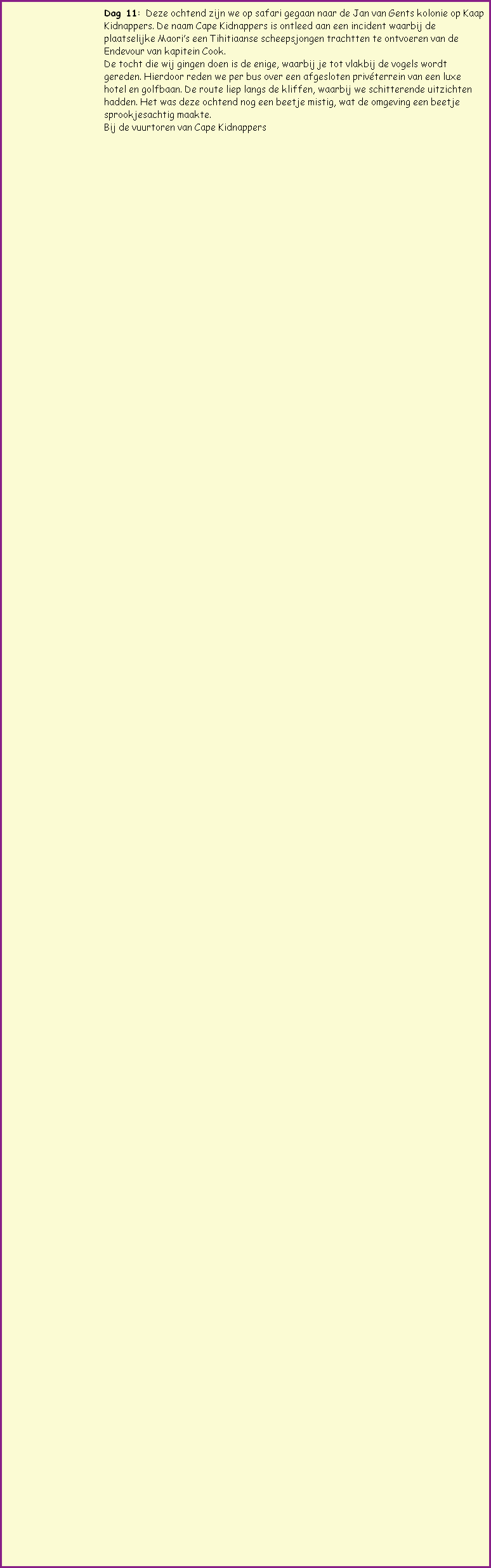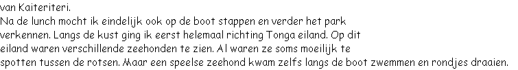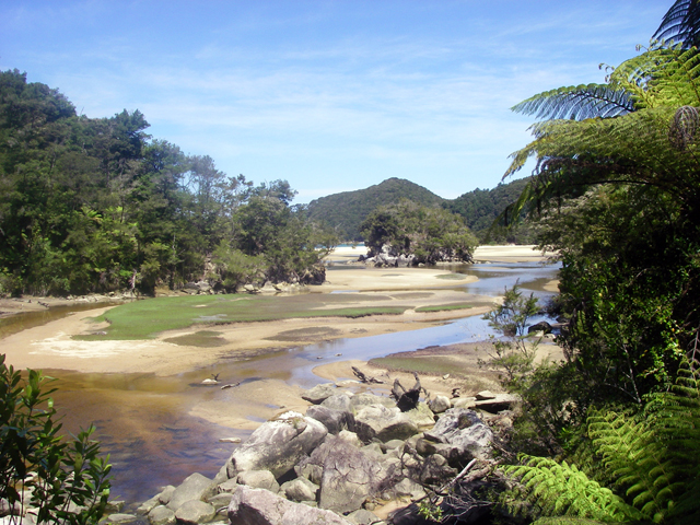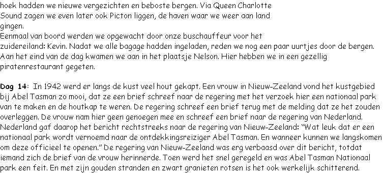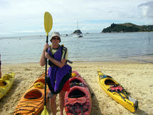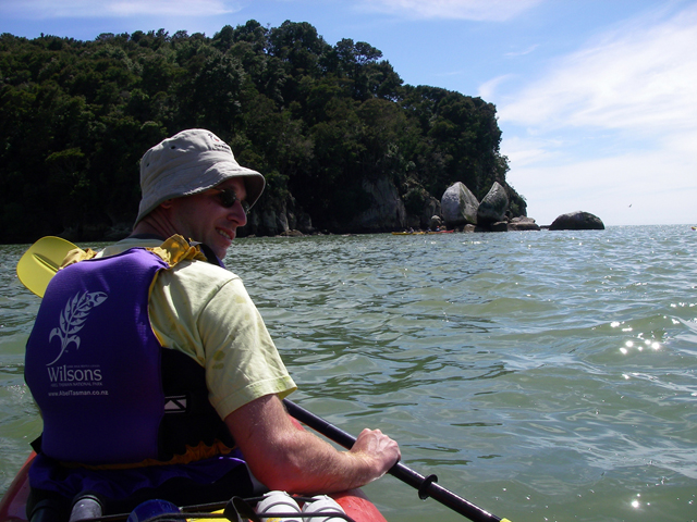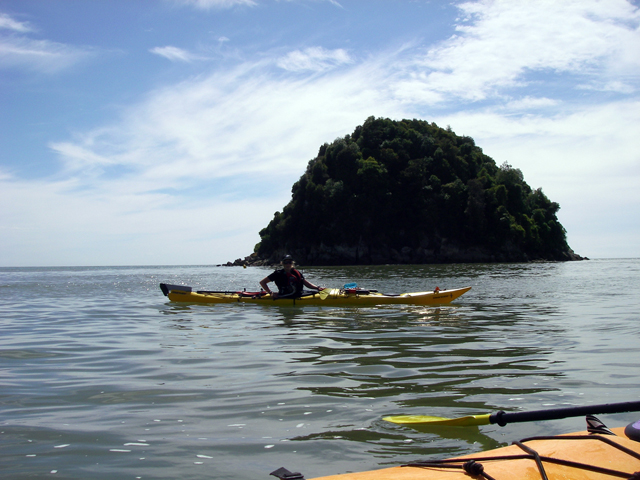 Het is wel duidelijk dat wij hier vandaag een bezoek aan gaan brengen. Dus op deze zonnige dag reden we naar Kaiteriteri, de opstapplaats voor de boot het park in. Nadat iedereen zijn kaartje had, stapte men op de boot. Als enige die achter bleef mocht ik iedereen wegzwaaien vanaf het strand. Ik zou namelijk eerst gaan zeekajakken. Vanaf Kaiteriteri zou ik zelf varen naar de naastgelegen baai. Hiervoor waren verschillende tweepersoons kajaks beschikbaar. Omdat ik al wat ervaring had met kajakken werd ik ingedeeld bij een van de begeleiders: Gina. Op deze