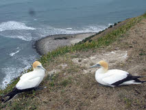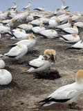 waren we ook bij de Jan van Gents. Deze vogels leven als grote groep op een heel klein stukje land, waar ze hun nest maken. Het is dan ook een herrie van jewelste als ze hun nest en klein stukje grond verdedigen tegen de andere vogels. In sommige nesten waren ook kuikens te vinden. Zelfs met de afzetting konden we vlakbij de vogels komen.