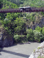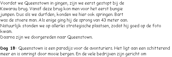 Mijn eerste uitdaging van deze dag was om ook een bungiesprong te maken. De spannendste maar ook de hoogste van Nieuw-Zeeland; 134 meter. Tijdens de rit naar de Nevis kloof begonnen de zenuwen toch wel een beetje op te komen. Waar was ik aan begonnen. Toen ik het eenmaal zag, had ik er ook wel veel zin in. Per gondel werden we naar het midden van de kloof getransporteerd. Hier moesten we wachten tot we aan de beurt waren. Toen ik aan de beurt was, had ik het gewoon in mijn hoofd, dat ik het moet doen. Dus onbevreesd stond ik op het randje en werd er afgeteld. Even later viel ik gillend (van plezier) omlaag. Tijdens de tweede keer omhoog komend, kon ik mijn voeten losmaken. Op dat moment zat ik in een meer zittende houding aan het harnas, wat een stuk prettiger was. Even later werd ik weer