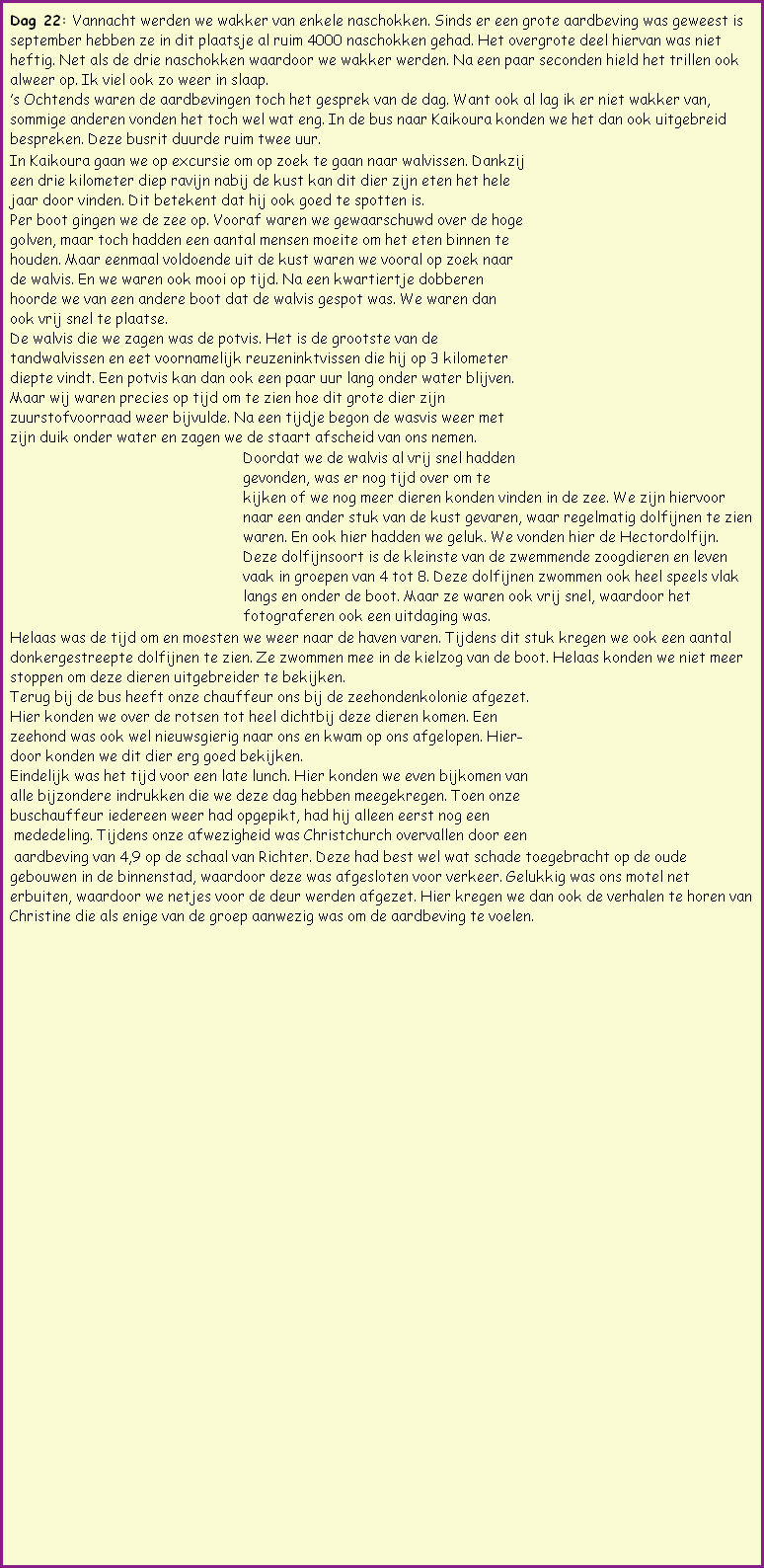 Dag 23: Vandaag konden we de stad zelf gaan verkennen. Ik ben in de ochtend een rondje gaan lopen door de binnenstad. Hier was goed te zien dat er een aardbeving geweest was. Bij diverse panden was de gevel omlaag gevallen en ook een straat was geheel afgezet, vanwege instortingsgevaar. Het motel had ook een zwembad. ’s Middags heb ik hier