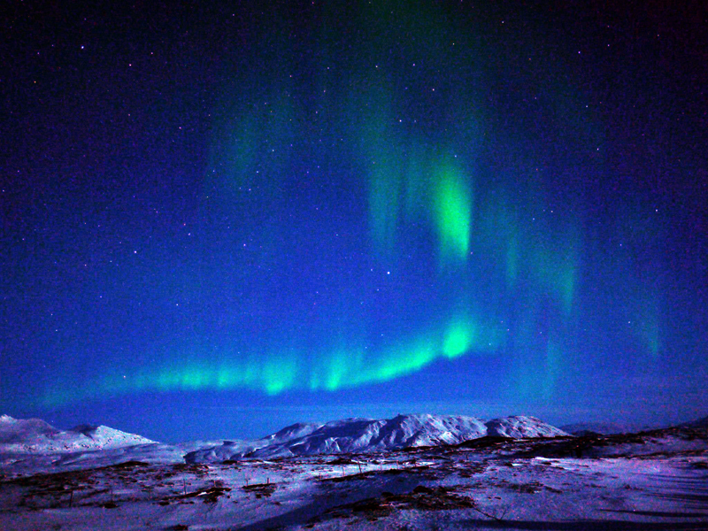´s Avonds hadden we ons opgegeven voor een Noorderlichttour. Op jacht naar de Aurora Borealis. Om half tien werden we opgehaald door een bus, die daarna doorreed naar het oosten. Hier waren enkele open plekken in de bewolking wat de mogelijkheid gaf om iets te zien. Helaas kwam er geen noorderlicht tevoorschijn en ook vanwege een