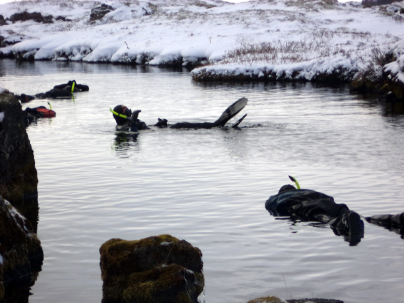 We zijn doorgereden naar Thingveller voor het middagprogramma, het blue. Hier zijn we in de Silfrakloof gaan snorkelen. Het water van deze kloof komt van een gletsjer welke 70 kilometer ver ligt. Maar door het lavagesteente heeft het de kloof bereikt. Al heeft het water er wel zo´n 60 jaar voor nodig om de afstand te overbruggen. Wat je overhoudt is kristalhelder water. De kloof zelf is een scheur tussen de Europese en de Amerikaanse tektonische plaat. Deze schuift hier met een snelheid van ca. 2cm per jaar uit elkaar.