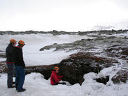 Met een lampje op onze helm zijn we via een scheur de lavagrot in gegaan. Bij de ingang was veel bevroren