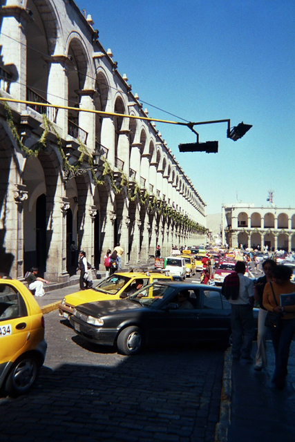 Dag 4: Arequipa is na Lima de grootste stad van Peru en ligt op 2235 meter boven zeeniveau. Hier kwamen we dan ook ’s ochtends aan met de bus. Vanaf het busstation naar het hotel namen we de taxi. De taxi’s hier is eigenlijk ook een avontuur op zich. Bijna iedere taxi is een kleine Deawoo waarmee door de straten gescheurd wordt. Tijdens zo’n rit deed het me denken aan een mierenhoop.