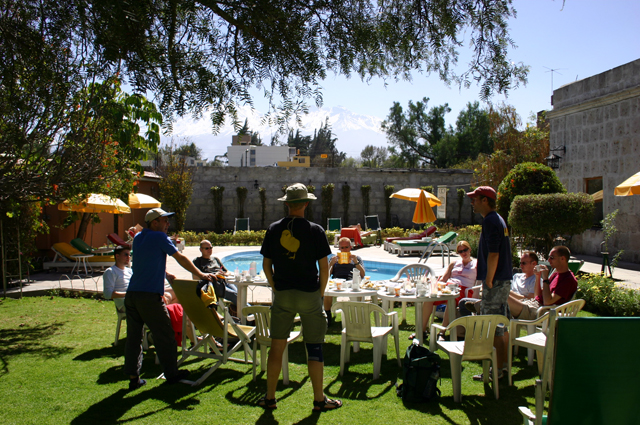 En deze ochtend bij het ontbijt, Arjen onze begeleider. Hij heeft het gered. Met veel kunst en vliegwerk in Amerika en Peru is hij er in geslaagd om op korte termijn een tijdelijk paspoort te regelen en ons zo snel mogelijk achterna te reizen.