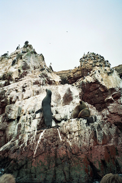 zo niet duizenden, zeevogels. Ook leven hier veel zeeleeuwen en enkele pinguïns. Mocht je verkouden zijn was dit geen enkel probleem, want deze roseilanden waren overladen met vogelpoep.