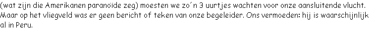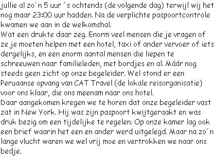 Dat maakt verder niet uit. Na het (opnieuw) inchecken in de volgende vlucht, was het nog maar zo´n 6 uurtjes voordat we in Lima aan zouden komen. Met al die verschillende tijdzone´s en zomer/wintertijd was het bij