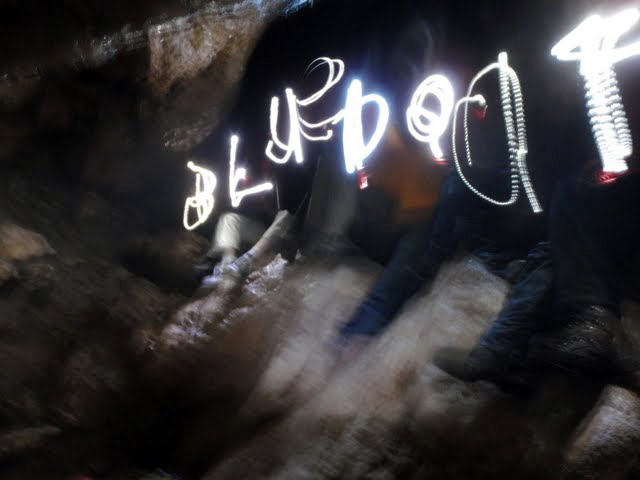 in de lucht schrijven: Blueboat. Ook probeerden de begeleiders ons bang te maken met een griezelverhaal over de grot en knierities. Helaas kwam het er allemaal niet helemaal goed uit, waardoor het allemaal erg grappig werd in het donker. Het eindpunt van de tocht was hoog op de berg, waardoor we via een abseil weer naar beneden moesten. Een mooi einde van de leuke speleologie.