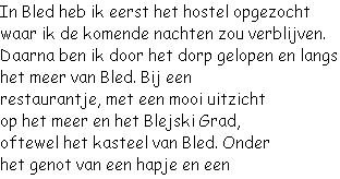 Halverwege de middag was het tijd om de bus te pakken. Niet de bus naar Nederland, maar een lokale bus die mij naar mijn volgende vakantiebestemming zou brengen. De lokale bus bleek uiteindelijk een touringcar te zijn. Genietend van het uitzicht onderweg reden we via de Vrsic-pas door het Triglav nationaal park. Met zijn 50 haarspeldbochten, die bij elke bocht werd afgeteld, duurde het dan ook wel even om over de pas te komen. Maar daarna ging het over de doorgaande wegen snel naar het plaatsje Bled.