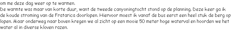 Maar dit was nog niet het einde van de tocht. Na het overwinnen van deze waterval, waren we nog maar halverwege onze canyoningtocht. Ook hier moesten we nog diverse keren springen, glijden en abseilen. In dit deel van de tocht was de kloof ook een stuk steiler en nauwer geworden. Maar aan het eind van de tocht scheen de zon volop. Eindelijk kon ik deze dag een beetje warm worden.