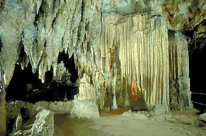 5 kilometer. De eerste twee kilometer werd afgelegd in een mijnwerkerstreintje en slingerde door de diverse grotten om allerlei druipstenen heen. Het was een beetje te vergelijken met het treinritje in de film Indiana Jones and the Tempel of Doom. Alleen was het uitzicht onderweg een stuk mooier. De wandeltocht liep vanaf de hoge berg in een enorme grot, door smalle gangen naar de “mooie grotten”. Elke nieuwe ruimte leek wel een