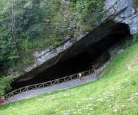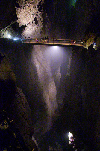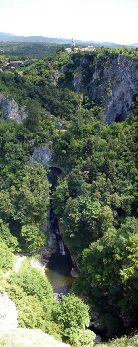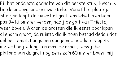 was. Wandelend tegen de stroming in had ik een formidabel uitzicht over de ruimte. Na totaal 2,5 kilometer door de grotten gelopen te hebben, kwam ik weer in het daglicht bij het enorme zinkgat Velika Dolina. Het pad liep hier omheen, waarbij er mooi zicht was op het verdwijnen van de rivier Reka in de grond. Bij het eindpunt had ik ook nog een schitterend uitzicht over de grootte van dit gebied.
