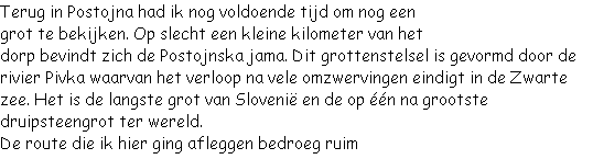 In de middag ging ik weer verder met de trein. Na een uurtje zigzaggend door het land te rijden, kwam ik aan in Postojna. Dit plaatsje wordt mijn uitvalsbasis voor de komende dagen. Het hostel stond hier niet echt duidelijk aangegeven, maar na wat inlichtingen gevraagd te hebben lukte het wel om deze te vinden. Het hostel leek alleen wel erg veel op een soort campusgebouw met algemene slaapkamers en centrale badkamers. Maar ik had wel een kamer voor mezelf alleen.