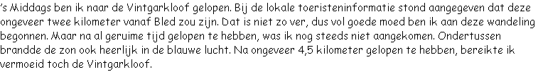 Maar bij het doorlopen van de kloof was ik de vermoeidheid zo vergeten. Het water afkomstig van de rivier, de Radovna, stroomt tussen twee verticale rotsheuvels Hom en Bort en is 1,6km lang. Langs deze kloof is een wandelpad aangelegd, waarbij deze op diverse