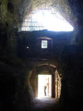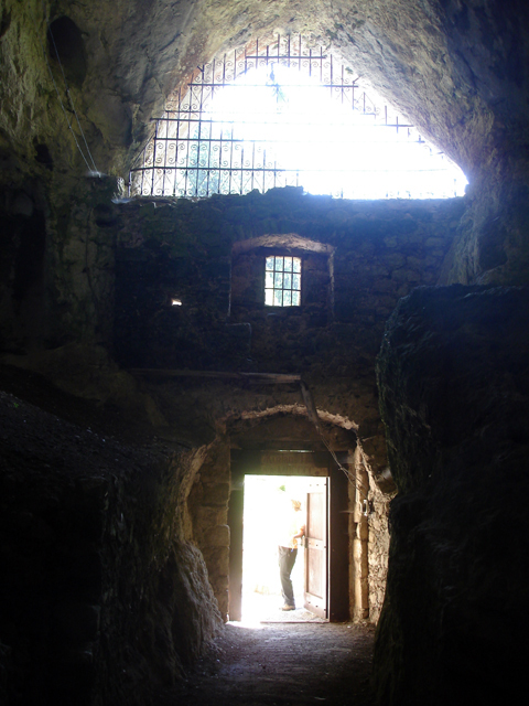 Skocjanske jame of Postojnska jama. De druipstenen waren ook al lang geleden uitgedroogd door het gebrek aan water, waardoor deze al versteend waren. Vanaf de grote zaal liep ik door de vleermuizengang richting de uitgang. De uitgang bevond zich weer 25 meter boven het kasteel.