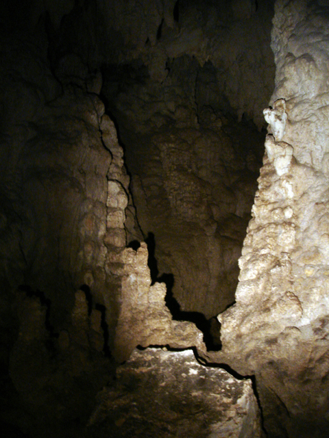 Met zaklantaarns liep ik over een aangelegd pad door de grot. Hier waren alle druipstenen en bijzondere rotsen niet uitgelicht zoals bij