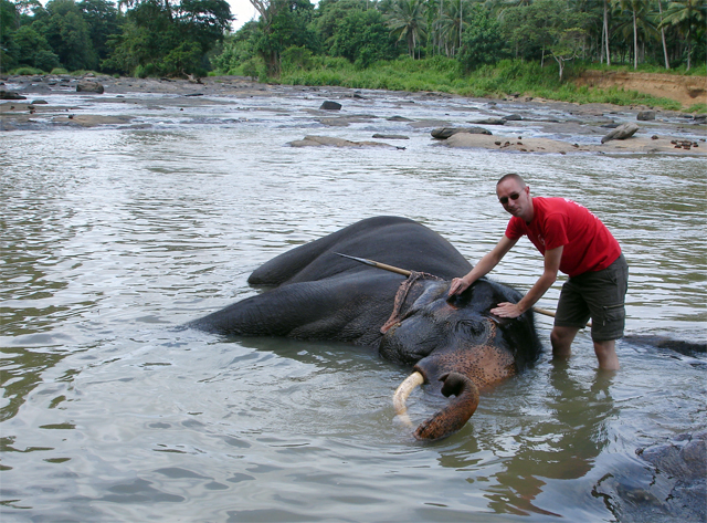 een nabijgelegen gebouw. Hier krijgen de babyolifanten flessen melk. Rond tien uur worden de olifanten naar de rivier geleid waar ze lekker kunnen badderen. Vanaf het weeshuis tot aan de rivier en bij de rivier lopen de