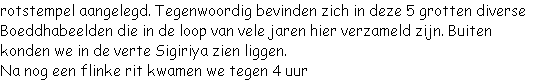 Dag 5: Vanochtend reden we richting Sigiriya. Sigiriya is een 175 meter hoge rots waarop en omheen een paleis heeft gestaan in de 5e eeuw. Dit paleis was voorzien van diverse terrassen en waterpartijen, omgeven door muren en grachten. Dit terrein en voornamelijk het paleis boven op de rots wordt gezien als het 8ste wereldwonder.