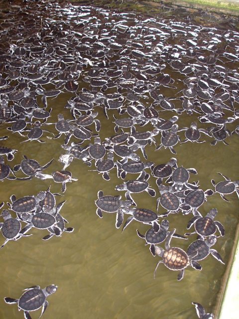 eieren van diverse schildpadden uitgebroed. Dagelijks zien er zeker 100 nieuwe schildpadden het levenslicht. Na vier dagen hier te verblijven zijn ze sterk genoeg om uitgezet te worden in zee. De kleine schildpadden zien er ook heel grappig uit. Ook zijn er enkele grotere schildpadden. Vaak zijn deze gewond en worden hier verzorgd. Als het kan worden ze daarna weer uitgezet in het wild.