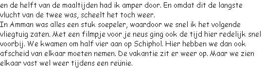 het vliegveld gaan, dus de meesten gingen daarom vroeg naar bed. Zelf heb ik op een terrasje nabij de zee een boek gelezen om de tijd te doden.
