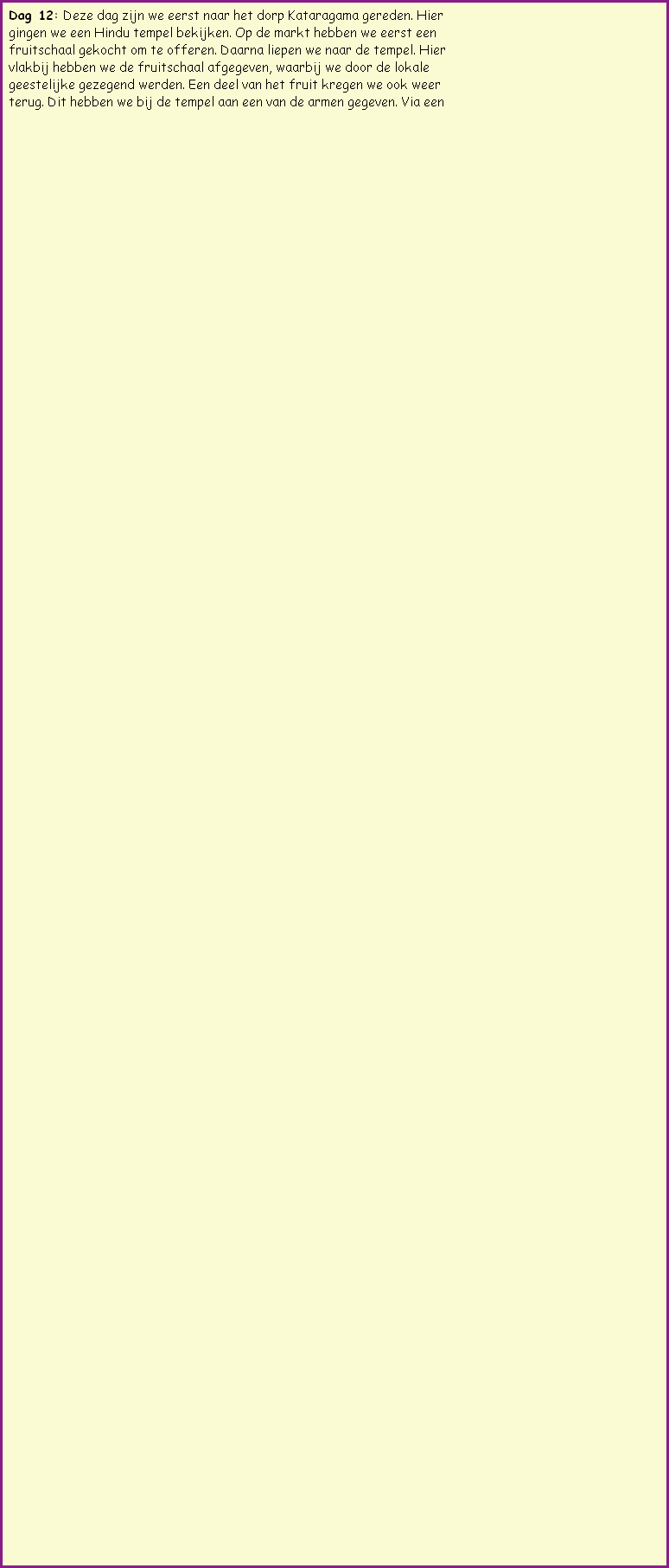 Sri Lanka is een schitterend land. Het staat vol van de diversiteit. De ene dag zit je midden in de hoge bergen, terwijl je een dag later over vlakke lange wegen rijdt. Daarnaast is bijna elke plaats die je aandoet bijzonder. Dit is moeilijk in woord en beeld uit te drukken.